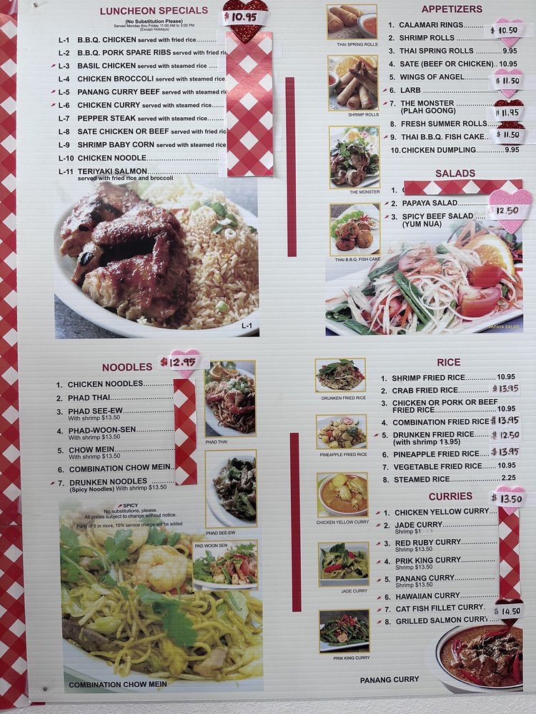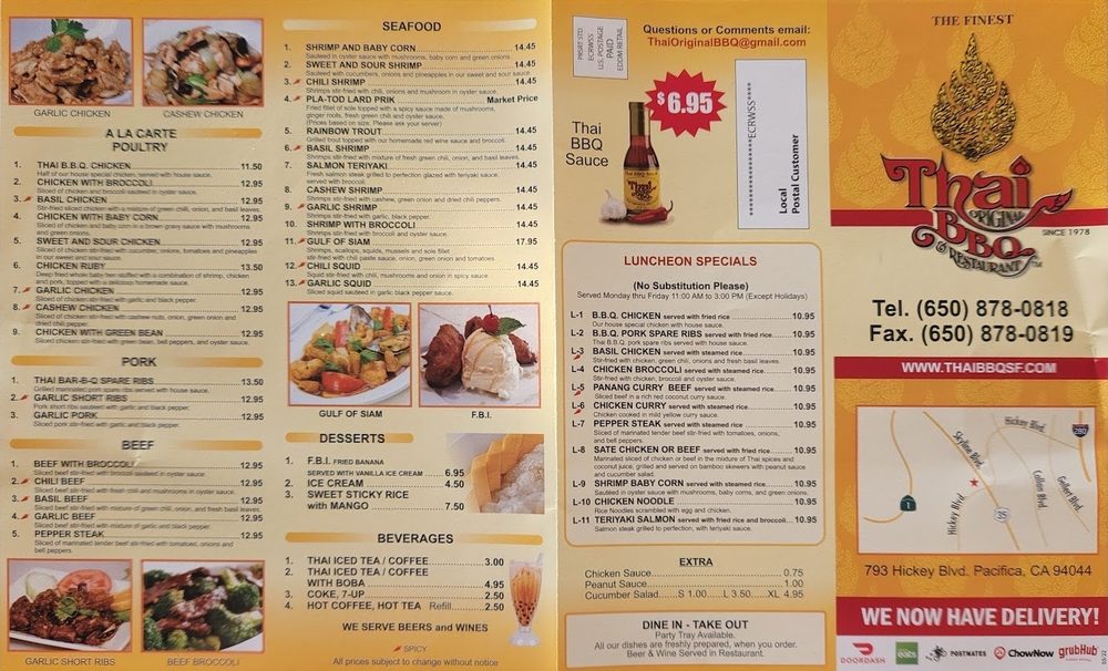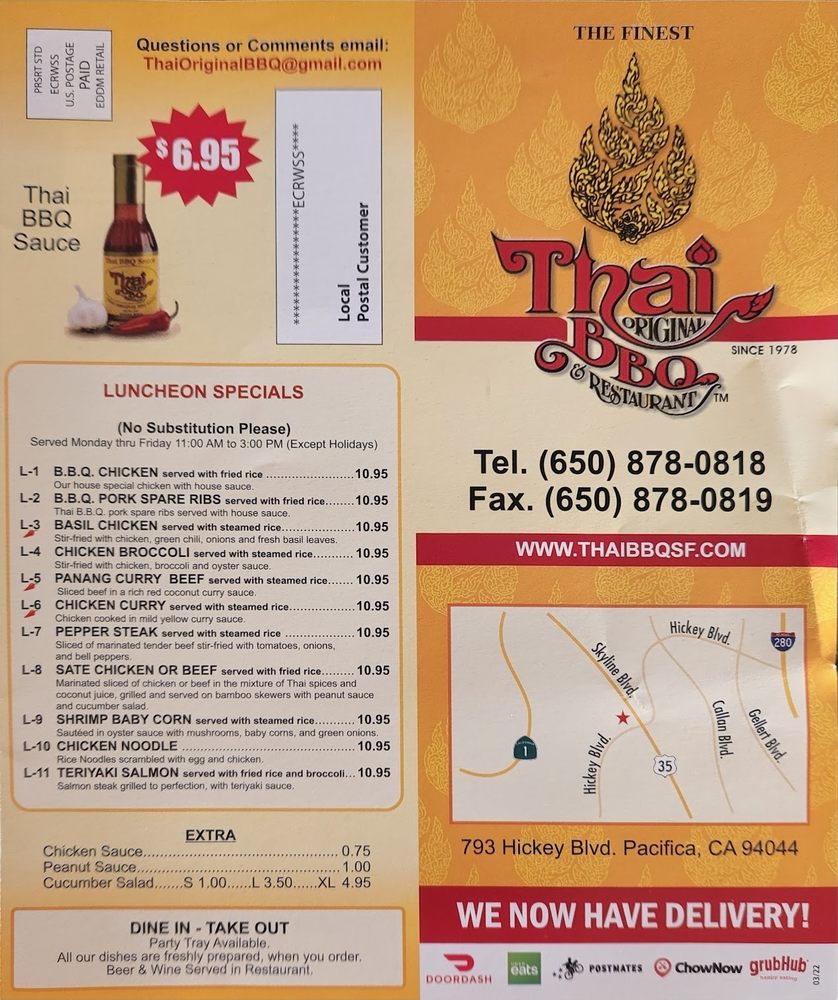 Located in Pacifica, CA, Thai Original BBQ is a renowned Thai restaurant with a loyal customer base and excellent online reviews. This eatery offers a wide range of options, from traditional Pad Thai to savory curry dishes and mouth-watering BBQ selections. Customers rave about the flavorful Cashew Tofu and Pork Spare Ribs, highlighting the authenticity and deliciousness of the food. With convenient takeout services, hot and fresh meals are ensured, making dining at Thai Original BBQ a seamless and enjoyable experience. The friendly staff adds to the overall positive dining atmosphere. Whether you're a fan of classic Thai dishes or looking to try something new, Thai Original BBQ is highly recommended for a tasty and convenient dining option.