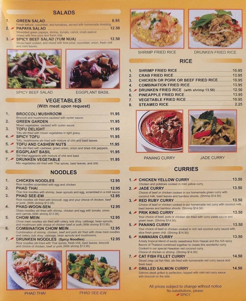 Rice noodles stir-fried with thai spices, fresh chili, basil leaves, broccoli and choice of chicken, beef or pork. Spicy.